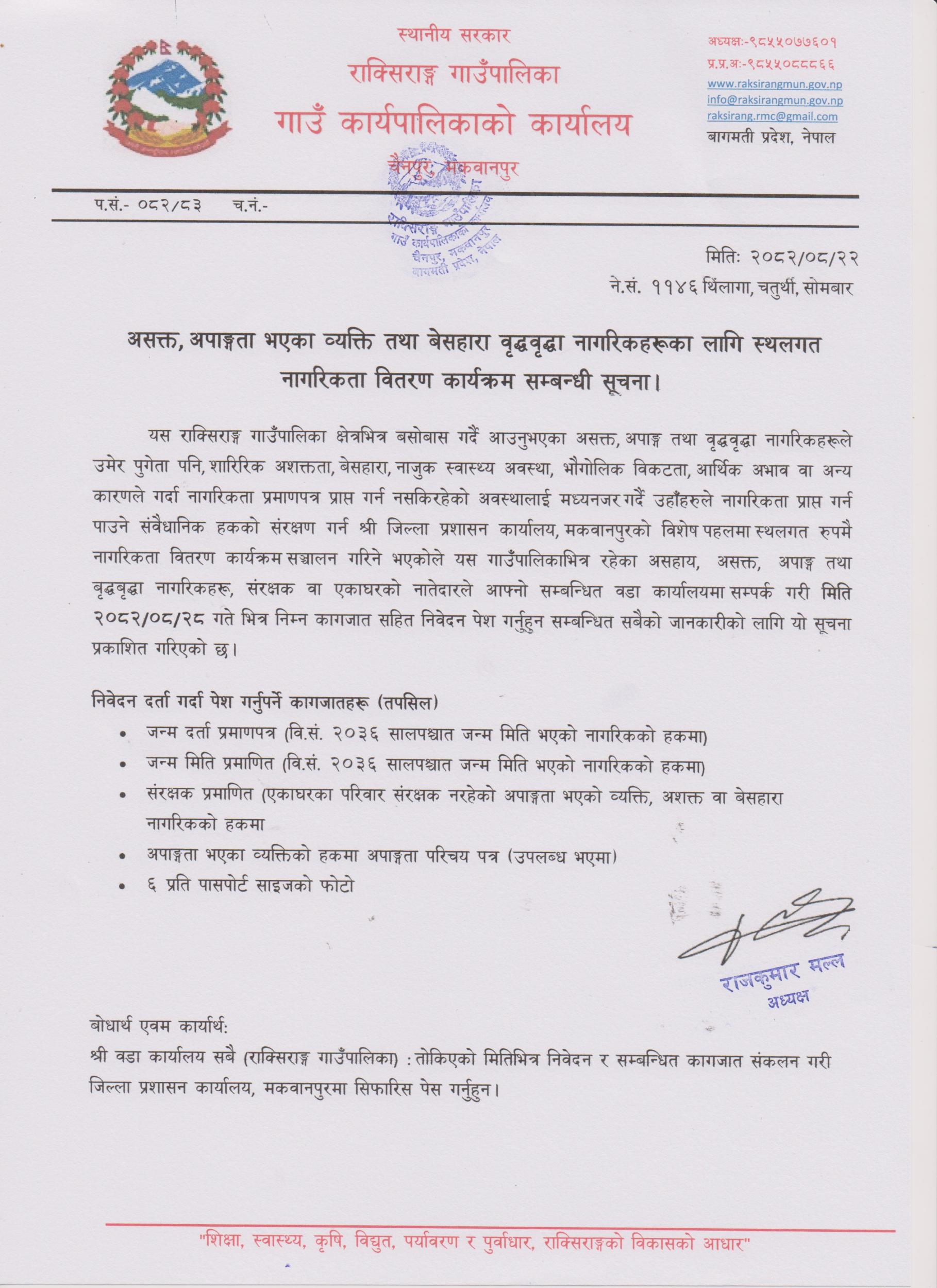असक्त, अपाङ्गता भएका व्यक्ति तथा बेसहारा वृद्धवृद्धा नागरिकहरूका लागि स्थलगत नागरिकता वितरण कार्यक्रम सम्बन्धी सूचना।