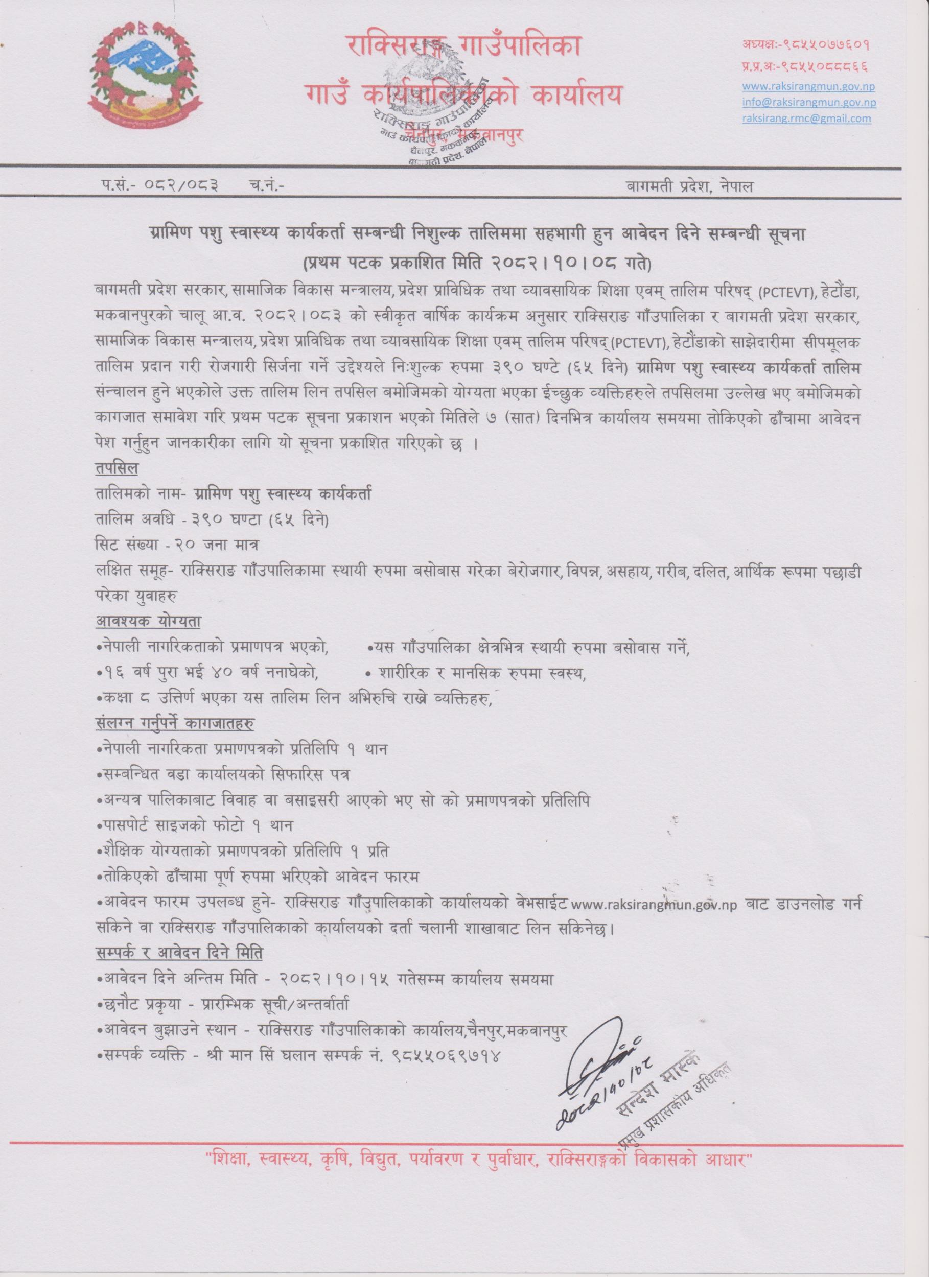 ग्रामिण पशु स्वास्थ्य कार्यकर्ता सम्बन्धी निशुल्क तालिममा सहयोगी हुन आवेदन दिने सम्बन्धी सूचना।