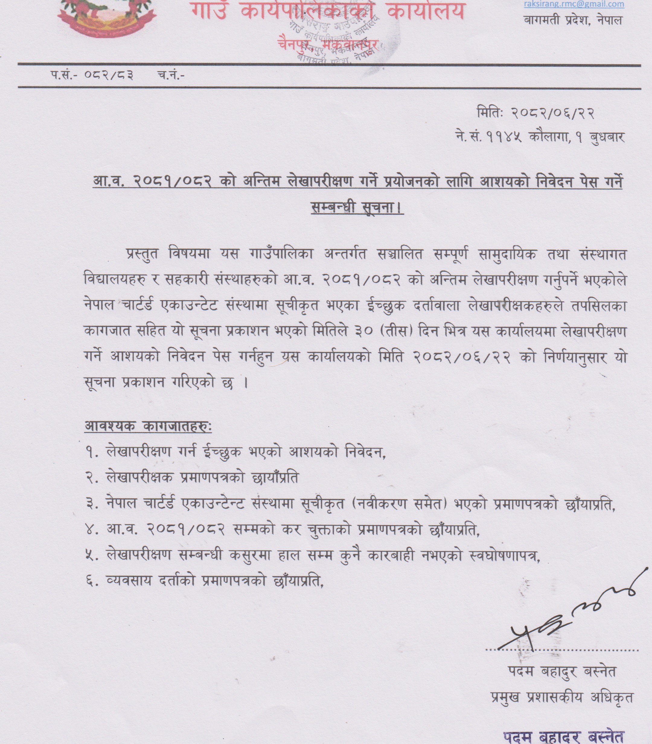 लेखापरिक्षण गर्ने प्रयोजनको लागि आशयको निवेदन पेस गर्ने सम्बन्धी सूचना।