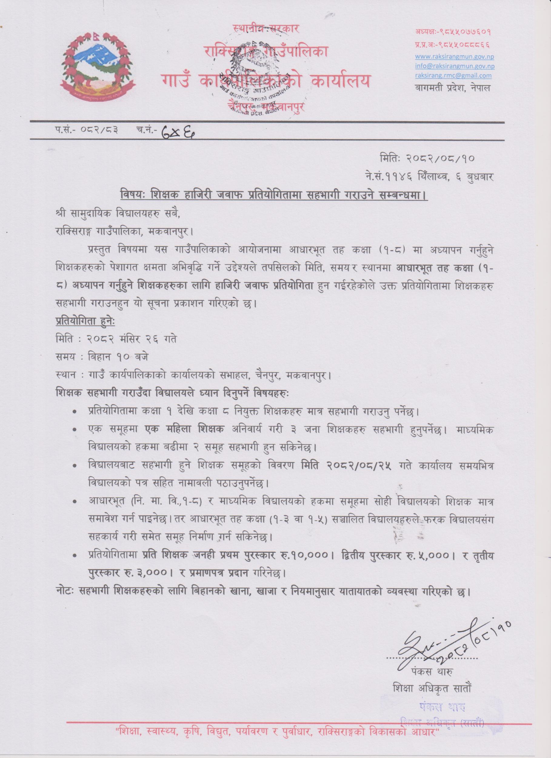 शिक्षक हाजिरी जवाफ प्रतियोगितामा सहभागी गराउने सम्बन्धमा।