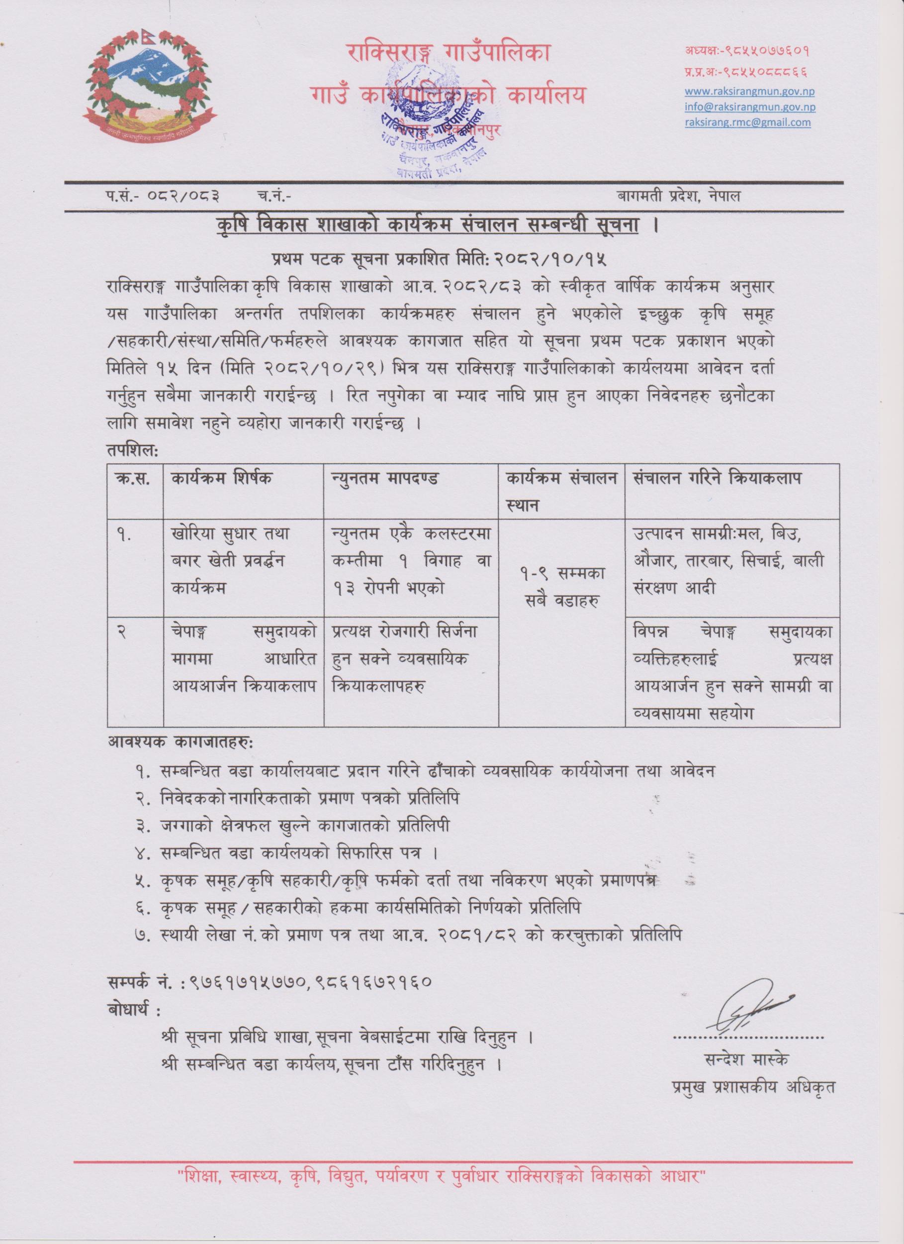 कृषि विकास शाखाको कार्यक्रम संचालन सम्बन्धी सूचना