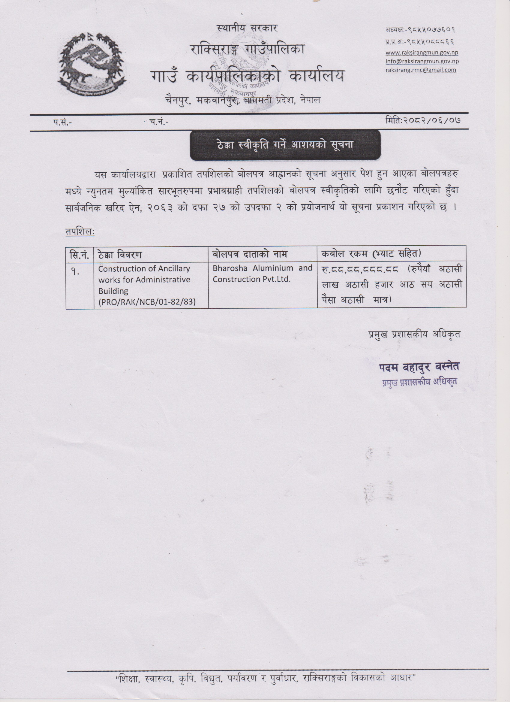 ठेक्का स्वीकृति गर्ने आशायको सूचना।