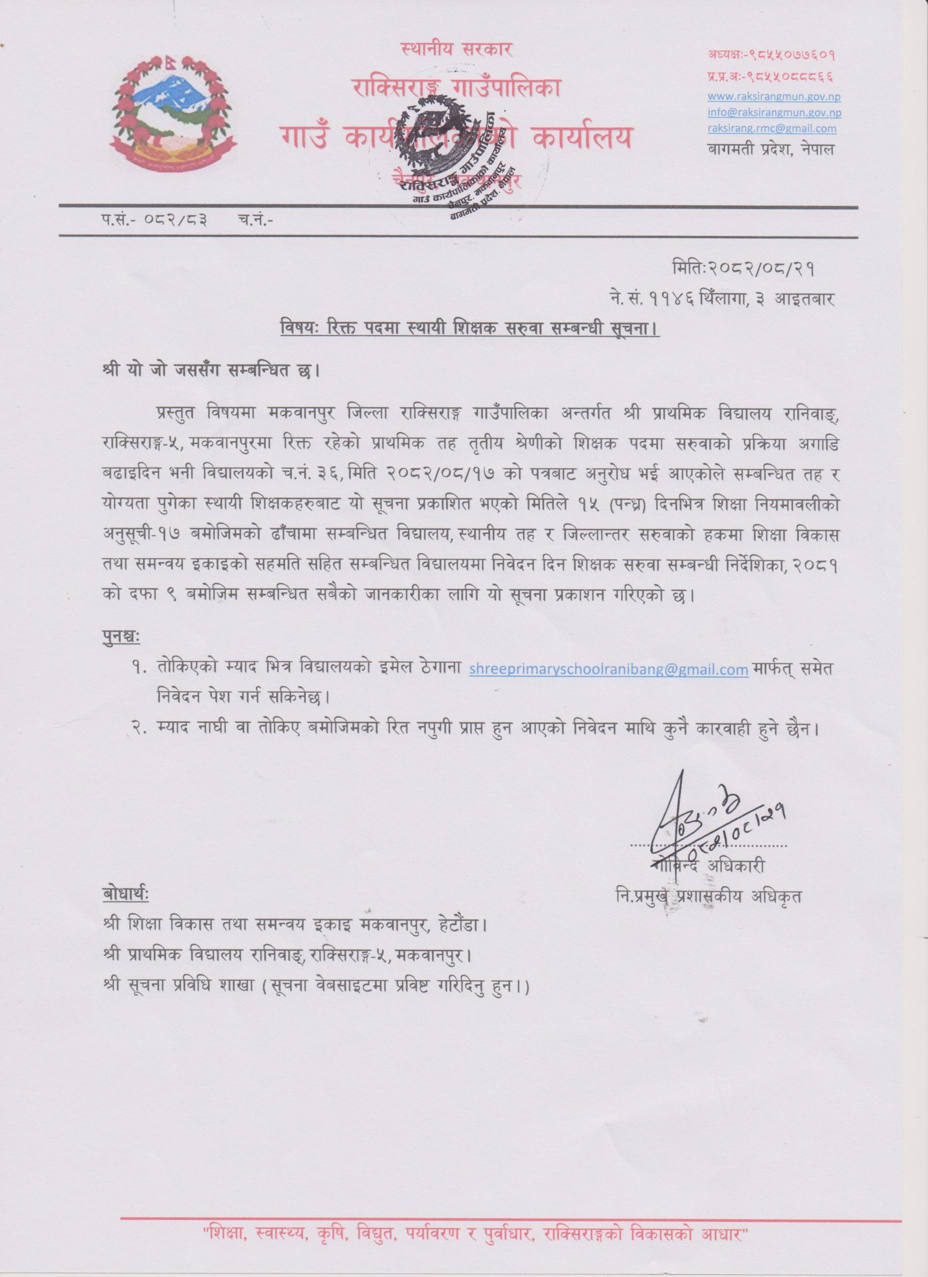 रिक्त पदमा स्थायी शिक्षक सरुवा सम्बन्धी सूचना ।